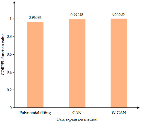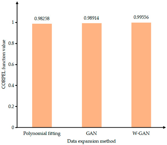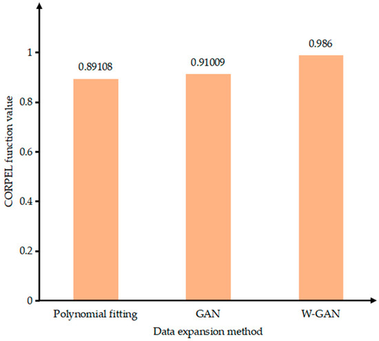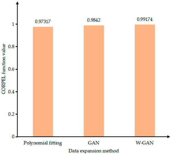 As shown in Figure 12, the time domain diagram of A phase current fault data and real fault data was enhanced by three methods in the same coordinate system. There is a large deviation near 4.45 s of the data expanded by GAN. The data generated by polynomial fitting method can describe the trend of the curve as a whole but lacks local data features. The data expanded by WGAN can better fit the original data in terms of data trend and size. Figure 13 shows the CORREL function values of the three data enhancement methods, indicating the correlation between the expanded data and the original data. It can be seen from the figure that the polynomial fitting method has the lowest data correlation after expansion. The expanded data of WGAN has the highest correlation and can best express the characteristics of the original data.