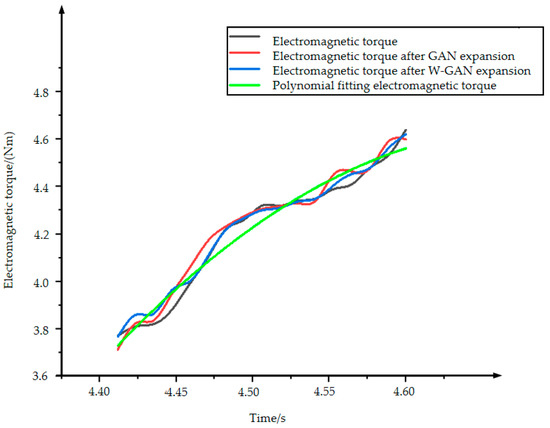 Figure 16 shows the original data of electromagnetic torque and the three types of expansion data. The data expanded by GAN has a data jump after 4.55 s, which deviates from the original data. The data using polynomial fitting has a large amount of data around 4.5 s which cannot fit the original data well. The data generated by the WGAN expansion method has a good fit with the original data as a whole and there is no partial deviation of the data. At the same time, it can be seen from the Figure 17 that the calculated value of the CORREL function between the data generated by WGAN and the original data is 0.9956. It shows that the data generated by this method has a higher correlation with the original data.