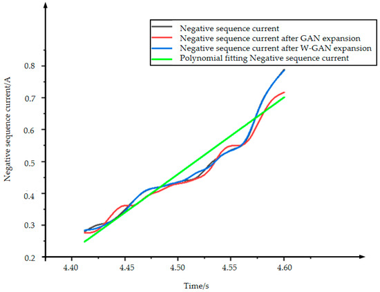 Figure 18 shows the original time domain diagram of the negative sequence current. The data after GAN expansion deviates around 4.45, 4.55, and 4.57 s, and the data is unstable. The data using polynomial fitting completely loses the original data characteristics from 4.50 to 4.57 s, and the generated data loses credibility. The data expanded using WGAN maintains a very good fit with the original data. It can be seen from Figure 19 that the CORREL function value of the data generated using the WGAN expansion method is as high as 0.99939. Therefore, compared with GAN and polynomial fitting method, the data generated by WGAN has a better fit with the original data.