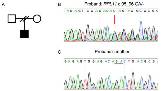 (A) Family pedigree; due to divorce of the proband’s parents, no Sanger DNA sequencing was obtained from the proband’s father. Sanger DNA sequencing of RPL11 exon 2 from peripheral blood cells taken from the proband (B) and his mother (C). Sequences of both forward and reverse strands shown. Red arrow in (B) depicts where deletion began. Red line in (C) indicates reference alleles.