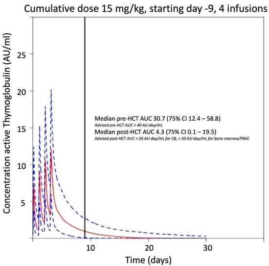 Based on a cohort of 260 patients with ages varying from 0.1–21 years old, a population PK model was developed to both describe the PK of thymoglobulin and the effect of growing up on the PK parameters [13,14,15]. The developed model could well predict thymoglobulin concentrations in all age groups and was extensively validated using resampling and simulation techniques. Two variables, the body weight of 10.5 kg (clearance and volume of distribution) and the pre-conditioning peripheral blood lymphocyte count of 4850 per µL (clearance), clearly influenced the PK. Using the developed PK model and the known therapeutic window, an individualized dose of thymoglobulin can be determined based on body weight and pre-thymoglobulin peripheral blood lymphocyte counts for the patient. Then, the simulation studies were performed, with the thymoglobulin dose and timing varied relative to the HCT, while fixing the patient- and treatment-specific details to this patient, aiming for an optimal pre- and post-HCT exposure. A total of 1000 simulations were performed, with full inter-individual variability, and the median and 75% confidence interval were derived. The thymoglobulin dosage (15 mg/kg divided into four daily doses starting from day-9) was chosen, targeting AUC of 30.7 AU·day/mL pre-CBT and of 4.3 AU·day/mL post-CBT, respectively.