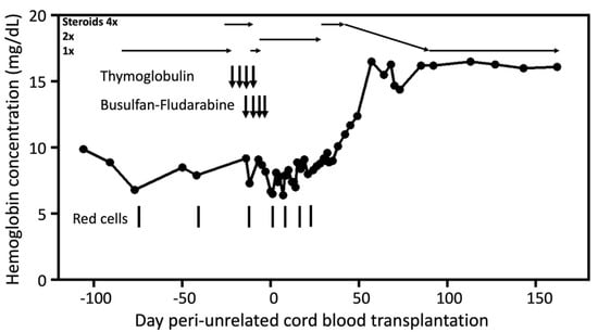 Peri-transplant hemoglobin concentrations and treatments of the patient, with day 0 indicating the day of cord blood infusion. Bars indicate red cells transfusions. Downward arrows indicate the days’ conditioning agents (thymoglobulin, busulfan, and fludarabine) given. Horizontal arrows indicate the different comparative dosages of steroids given with 1× corresponding to maintenance 12.5 mg cortisone twice daily.