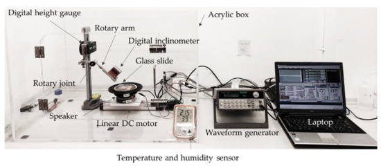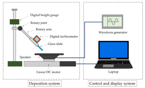 In the deposition process, the linear motor was connected to a laptop for precisely controlling deposition speed, in the range of 1 μm/s to 0.3 cm/s, using Mach3Mill software. The speaker was connected to an arbitrary waveform generator (Agilent, Santa Clara, CA, USA, 33210A) for applying the vertical vibration frequency and amplitude in the range of 40 Hz–15 MHz and 50 mVP-P–10 VP-P, respectively. The deposition system was placed in an acrylic box for humidity control. The VVBC was assembled as shown in Figure 2.