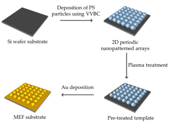 To prepare the MEF substrate, the 2D periodic nanopatterned arrays prepared under the optimum condition obtained from previous sections were used as a template for Au deposition. Firstly, the template was exposed for 5 min of plasma treatment at an operating power of 30 W and a pressure of 0.2 Torr for adjusting the gap between particles to prevent a bulk film formation during the Au deposition process [24,25]. After that, the pre-treated template was coated with a Au thin film using magnetron sputtering. The sputtering system was evacuated to 5 mTorr, then filled with Ar gas before initiating the sputtering process at an operating power of 100 W for 10 min. The as-prepared MEF substrate was cut into pieces sized at 5 mm × 5 mm. The morphology of the Au films deposited onto the template was observed using FE-SEM. Figure 3 illustrates a schematic of the procedure used for fabricating the MEF substrate.