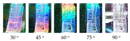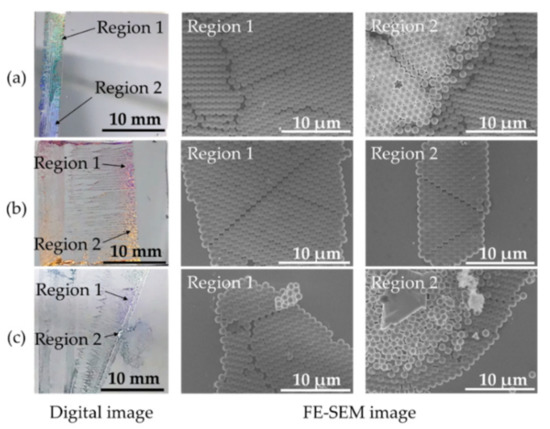 As seen in the digital images of Figure 4, the interference patterns in region 1 could be viewed directly with the naked eye, indicating the existence of PS particles on the substrate. This phenomenon was a result of the self-assembly arrangement of the PS spheres in HCP monolayer arrays acting as a waveguide in the photonic crystal structure [29,32]. A colorful interference pattern was observed when the angle of incident light was changed, as shown in Figure 5. Similarly, the FE-SEM images in Figure 4 confirmed the presence of a self-assembled monolayer of PS spheres. However, the multilayer arrays formation was also found in region 2, leading to no interference pattern appearance due to Bragg’s law [29,33].