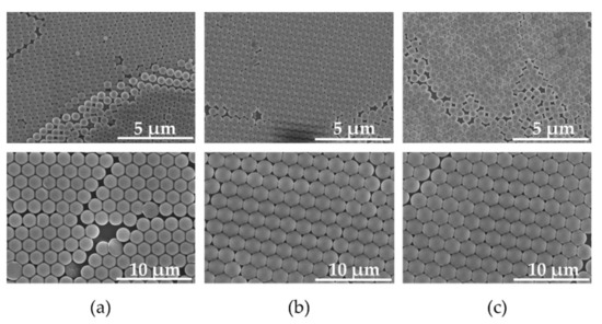 It has been reported that the hexagonal close-packed (HCP) nanostructure that is formed through colloidal lithography techniques can be used as a template for preparing a highly efficient MEF substrate due to its tunable LSPR field [19]. Among several colloidal lithography techniques [16,20,21,22,23], convective deposition has gained much interest because of its simplicity, rapidness, and relatively low cost. It is a well-known technique for the convective self-assembly of colloidal nanospheres during solvent evaporation and consequent formation of a thin film with closed-packed structures using convective steering and capillary interaction [24,25]. However, some persistent problems associated with controlling the film’s uniformity and defects, including a non-close-packed structure, dislocation, and void, have occurred frequently [26]. Therefore, many researchers have attempted to improve the hexagonal close-packing density and the film uniformity of 2D periodic nanopatterns by adding a surfactant to reduce the surface tension of a solvent, simultaneously introducing the co-assembly of large and small colloidal particles of different sizes [27,28,29,30], or simultaneously applying mechanical vibration in the lateral direction to the deposition process, using a piezo-electric transducer [27,28]. Although these techniques can overcome the dramatic latency issues of the convective deposition technique, they require complicated steps and expensive apparatuses [27,28,29,30].