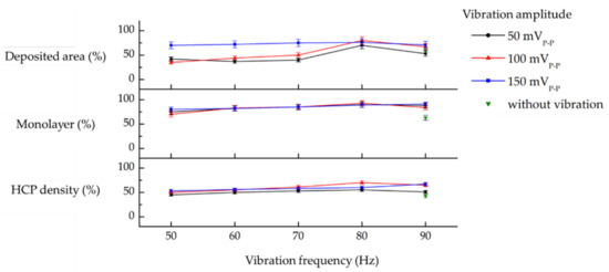 To determine the effect of applying vertical vibration during a coating process, the process was conducted under the following conditions: the deposition angle was 45°, the deposition speed was 5 µm/s, the vibration frequencies were varied in a range of 50–90 Hz, and the vibration amplitudes were 50 and 100 mVP-P. Figure 9 shows the obtained result; it was found that applying vertical vibration to a coating process obviously affected the film quality, especially the HCP and monolayer formation occurring in the presence of meniscus stability [38]. At a frequency of 80 Hz and an amplitude of 100 mVP-P, the film quality was dramatically improved because this frequency might be close to the natural frequency of PS colloidal particles with a diameter of 1 μm, resulting in particle vibration at its highest energy. With the increasing vibration energy, the evaporation rate of the suspension increased due to the heat generated from the oscillation, leading to the increase in deposited area and the decrease in interfacial tension between PS particles [28]. The results showed that the colloidal particles of the 2D hexagonal array was successfully prepared by the combination of a convective deposition with substrate vibration in a vertical direction.