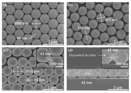 Figure 10a,b clearly show that the morphology of the 2D periodic nanopatterned template could be modified using a plasma treatment. By depositing Au thin film on the modified template, the MEF structure exhibited the larger particle size, increasing the surface roughness, as seen in Figure 10c. In Figure 10d, the inter-particle distance was approximately 61 ± 1.8 nm, corresponding with the desirable distance [3,11].