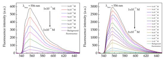 Figure 11 shows the fluorescence spectra of R6G with an emission peak at 556 nm on the silicon and MEF substrates. Using the silicon substrate, the fluorescence spectra of R6G were unable to observe at a concentration of below 1 × 10−6 M, as shown in Table 1. On the contrary, with the presence of the MEF substrate, the fluorescence spectra of R6G were able to record down to 1 × 10−8 M due to the MEF effect. The developed MEF substrate showed a good performance for R6G fluorescence enhancement due to the gap size of 61 ± 1.8 nm, as shown in Figure 10d, corresponding to the required feature size for the MEF phenomenon. This hotspot acted as an amplifier for the surrounding R6G molecules, resulting in a higher fluorescence intensity. Moreover, the surface roughness of metals deposited on the MEF substrate also played an important role in providing more LSPR fields, causing the increase in fluorescence intensity [39]. However, at a high concentration of R6G, the enhancement factor reduced due to the concentration quenching effect [40]. To estimate the fluorescence enhancement efficiency of the MEF substrate, the LOD and LOQ were determined. The calculated LOD and LOQ were found to be 3.3 × 10−9 M and 1.01 × 10−8 M, respectively.
