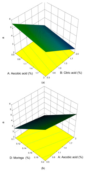 3.3. Effect of the Ascorbic Acid, Citric Acid, Potassium Sorbate, Moringa oleifera Leaf Extract Powder, Time, and Temperature on the Colour of Dried Apples