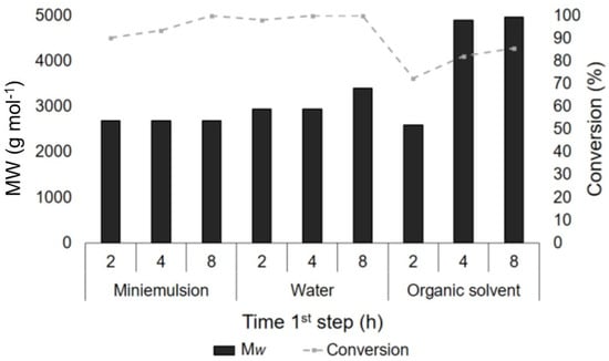 The use of the organic solvent in the first polymerization step resulted in POS of higher MW (16,200 and 19,800 g mol−1) at the end of the second polymerization step compared to those returned when miniemulsion or water were used in the first step (Figure 5). In the second polymerization step, an increase in temperature from 60 to 80 °C also led to an increase in POS MW from 16,000 to 19,800 g mol−1 after 24 h (Figure 5).