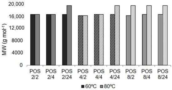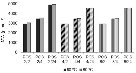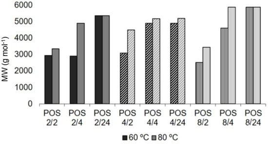 No significant variation was observed in the POS MW after the second step of polymerization using the prepolymer obtained in miniemulsion regarding the temperature tested, i.e., 60 vs. 80 °C (Figure 3). The incubation time of the first polymerization step did not significantly influence the MW obtained at the end of second step of polymerization (24 h) (Figure 3). However, an apparent increase in the polymer MW (2 h < 4 h < 24 h) was correlated with the time of exposure to both high temperatures in the second step of polymerization, i.e., the POS MW seemed to increase significantly from 2 to 24 h. This MW profile was not observed for the POS prepolymer synthesized for 2, 4, and 8 h in the first step of polymerization in miniemulsion, as a similar MW of 2800 g mol−1 was obtained for all the reaction time conditions (Figure 2).