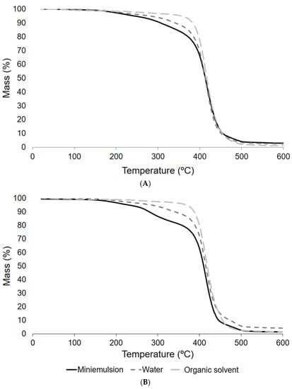 Thermograms of thermogravimetric analysis (TGA) of POS in miniemulsion, water, and the organic solvent (cyclohexane: THF (5:1 v/v)): (A) at the end of the 2 h of the first step of polymerization and (B) at the end of the 24 h of the second step of polymerization, i.e., the POS polymers identified by POS 2/24.