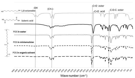 In a previous work, the chemical structure of poly(octamethylene suberate) was analyzed by the authors using 1H NMR []. In this work, the POS samples synthesized in the miniemulsion, water, and the organic solvent were assayed by FTIR analysis to confirm the polymer molecular structure and polymer purity (Figure 8).