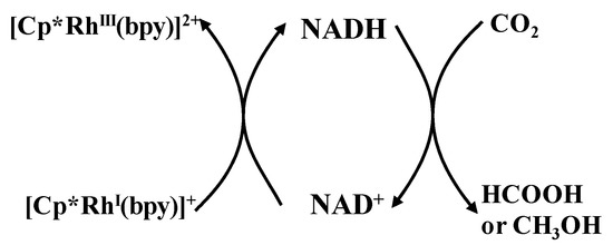 To achieve the NADH regeneration with high selectivity and efficiency, various organometallic complexes have been developed, such as Ir-based complex, Rh-based complex, and Fe-based porphyrins. Among them, the Rh-based catalysts [Cp*Rh(bpy)]2+ (Cp* = C5Me5; bpy = 2,2′-bipyridine) are popular, owing to their high stability and selectivity over a broad range of pH and temperature as well as the compatibility with the enzymatic system. Such catalysts have stable reduced forms and oxidized states in the homogeneous reduction system, which potentially achieve interconversion by the external driving force. In the enzymatic conversion of CO2 to formic acid, the cofactor NADH is oxidized to NAD+ by providing two electrons and one hydrogen to CO2 and forming formate. The RhI-based catalysts can efficiently reduce NAD+ to NADH while oxidizing RhI to RhIII, indicating that two electrons donated from RhI are transferred to NAD+ for generating NADH. As shown in Figure 3, CO2 can be converted to formic acid or methanol while oxidizing NADH to NAD+, and then, the Rh-based catalysts are used to regenerate NADH by providing electrons. However, the Rh-based catalyst cannot be recovered after reducing NAD+ to NADH while RhI is oxidized to RhIII, which is unsustainable and limits its application. Therefore, the recovery of Rh-based catalysts has been developed by combining the photochemical and electrochemical methods.