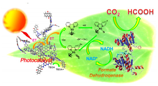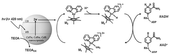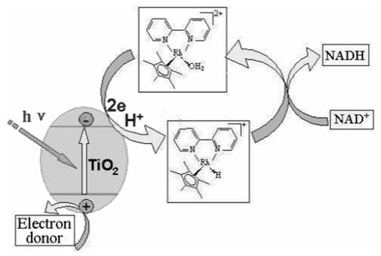 TiO2 has been widely used as photocatalysts in environmental and energy applications, owing to its high photoactivity, stability, safety, and low cost [25]. However, its band energy gap, 3.2 eV, limits the absorption of solar radiation, which accounts for only 4% of the solar spectrum [26]. To improve photoactivity, many efforts have been devoted to modifying TiO2 with quantum dots or nanoparticles to expand the energy bandgap with more negative conduction. To date, using doped carbon, boron, nitrogen, phosphorous, and CdS on TiO2 as photosensitizers and combining with the Rh-based complex have been extensively investigated. These quantum dots or nanoparticles can be tunned with size and surface-to-volume ratio, and typically, smaller quantum dots in size enhance photoactivity [27]. As shown in Figure 4, under irradiation, the photo-excited electrons will transfer from the electron donor (TEOA) to the Rh-based complex with the help of a photosensitizer, [28] and thus, RhIII is reduced to RhI, and the reduction of NAD+ to NADH catalyzed by the RhI complex can be achieved.
