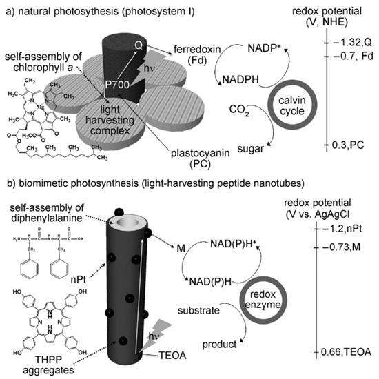 - Kim, J.H.; Lee, M.; Lee, J.S.; Park, C.B. Self-Assembled Light-Harvesting Peptide Nanotubes for Mimicking Natural Photosynthesis. Angew. Chem.-Int. Ed. 2012, 51, 517–520. [Google Scholar] [CrossRef] [PubMed]