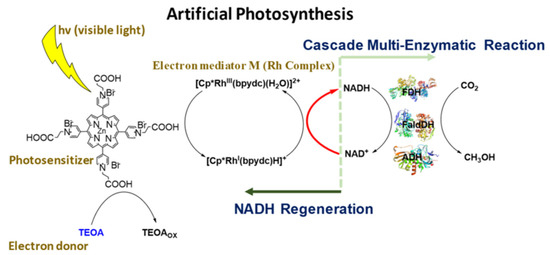 To achieve NADH regeneration coupling with CO2 conversion using the photocatalytic method, natural photosynthesis would be an ideal model. In natural photosynthesis, NADH is regenerated via multistep electron transfer, which is known as the Calvin cycle, where chlorophyll works as a photosensitizer, playing a key role in light-harvesting systems [23]. To establish an NADH regeneration system driven by photosynthesis, photocatalytic NADH regeneration should contain a photosensitizer, electron mediator, and electron donor [24]. Herein, the electron mediators can be the Rh-based catalysts, as described in the chemical regeneration of NADH, and the electron donors can be water or electron-rich chemicals (triethanolamine). The photosensitizer is used for recovering the electron mediators. The photocatalytic regeneration of NADH can be coupled with enzymatic CO2 conversion, where both inorganic and organic photosensitizers are introduced for regenerating NADH.