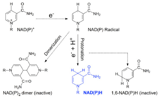 Electrochemical NADH regeneration is a promising solution and can be potentially used in a large-scale application, as electrocatalysis can provide a stable current density at a low cost. Moreover, it is more “clean” compared to other methods without by-product separation. The electrochemical regeneration of NADH can be categorized as direct and indirect regeneration. The direct reduction can be accomplished by receiving two electrons and one proton. The mechanism can be briefly summarized in three steps [26,39]. As shown in Figure 10, under the potential from the cathode, NAD+ firstly receives one electron to form radical species NAD+·. Then, the radical NAD+· will be protonated and finally receive the second electron to generation NADH (1,4-NADH) [40]. The electrochemical reduction of NAD+ also suffers from low selectivity, and by-products (NAD2 and 1,6-NADH) are usually formed under the potential of higher −1.6 V in the second step [41]. To improve the selectivity, various metal-based electrodes were prepared to enhance the kinetics of the second reaction step, and thus, the potential can be decreased and the selectivity is improved [26].