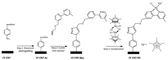 Compared to the direct regeneration of NADH, the indirect regeneration typically exhibits high selectivity. The characteristic of the indirect method employs an electron mediator, which acts as an electron carrier and achieves two electrons and one proton transfer in one step. Similar to the photochemical regeneration of NAD+, the Rh complex has also attracted attention in electrochemical regeneration, owing to its high selectivity for reducing NAD+ and stability of different valences of the Rh complex. Compared to the photochemical regeneration, electrochemical regeneration is much more “clean” without using photosensitizer and electron donors, which is beneficial to reduce cost and separate product in the downstream operation. For instance, Kim et al. [48] used [Cp*Rh(bpy)Cl]+ complex as a mediator and copper electrode for electrochemically reducing NAD+ and applied it in the enzymatic conversion of CO2 to formic acid. The applied potential was less negative (<−0.9 V vs. SCE) value, avoiding the generation of by-products NAD2 and 1, 6-NADH (1.6 V). The selectivity of NAD+ reduction to NADH is almost 100%, and the established system is much more simple and efficient compared to the photochemical method. Following this work, the Rh complex was grafted on the electrode to facilitate the product separation and recycling the Rh complex. Zhang et al. [49] developed a method to graft the Rh complex on a porous carbon electrode. As shown in Figure 11, the azido-functionalized electrodes were firstly prepared by the electrochemical reduction of 4-azidophenyl diazonium cations. Second, the bipyridine ligands were attached to the azido group via a Huisgen cycloaddition reaction. Last, the (RhCp*Cl2)2 dimer was coordinated to the bipyridine ligands, and thus, the Rh complex-grafted electrode was prepared with the covalent grafting for the electrochemical reduction of NAD to NADH. As a result, the Rh complex-grafted electrode presented a high Faradaic efficiency of 87% and high stability with more than 90 h, making this system promising for the application to the electroenzymatic synthesis. Later, a more easily grafting method was developed [41] by replacing the bipyridine ligand with 2,2′-bipyridyl-5,5′-dicarboxylic acid. By alkalifying the electrode with the generation of the hydroxide group, the Rh complex with the carboxylic group was directly covalently immobilized to the electrode, achieving almost 100% selectivity.