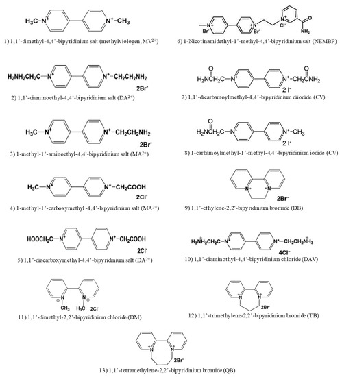 Mimicking the natural cofactor, an artificial cofactor should play as an electron carrier supplying to FDH for CO2 conversion. Bipyridine salts can be desirable candidates, as they can achieve electron acceptance and release by the external driving force. Similar to the natural cofactor, the artificial cofactor has both oxidized and reduced forms, and the reduced form could be used in the enzymatic conversion of CO2 by providing electrons. The artificial cofactors that have been developed are summarized in Figure 13. All of them are used in the enzymatic conversion of CO2 combined with chemical, photochemical, or electrochemical regeneration.