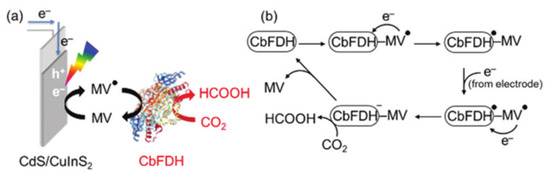(a) Photoelectrochemical CO2 reduction to formate over a hybrid system of CdS/CuInS2 photocathode and FDH, and (b) CO2 reduction to formate with FDH and two molecules of MV+·.