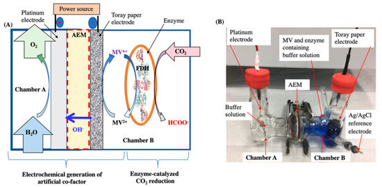 Toward the practical application, Buddhinie et al. [60] designed a novel three-compartment cell separated by ion-exchange membranes to continuously electro-enzymatically produce formate using artificial cofactor and in situ separate the methyl viologen radical cation and formate (Figure 16). Formate yields as high as 97 ± 1% could be realized by avoiding the adventitious reoxidation of the methyl viologen radical cation by molecular oxygen. These results demonstrated that the artificial cofactor could potentially substitute the natural cofactor, and they are more efficient, stable, and cheap. Combining the electrochemical regeneration, the large-scale application of enzymatic CO2 conversion can be realized in a sustainable way.