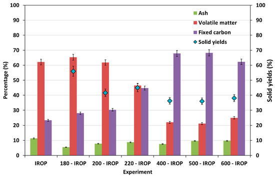 The content in ash, as an indicator for minerals content in the feedstock and carbonaceous materials, slightly decreased from 11% to 5% for IROP and 180-IROP, respectively, then increased gradually until reaching 9% and 10% for 220-IROP and 600-IROP, respectively. The initial decrease of ash could be attributed to the elimination of some minerals at low carbonization temperatures especially potassium [41]. In the case of hydrochars, when increasing carbonization temperature, the volatile matter content reduced, and simultaneously, ash minerals content increased.