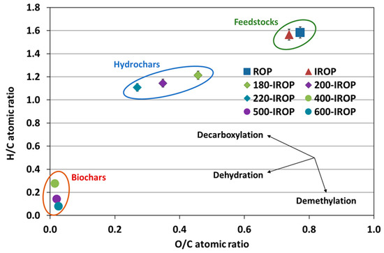 The elemental composition of the IROP and produced hydrochars and biochars is presented in Table 2.