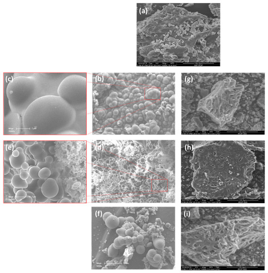 Scanning electron microscope images of (a) impregnated raw olive pomace and the produced (b–f) hydrochars and (g–i) biochars under different carbonization conditions.