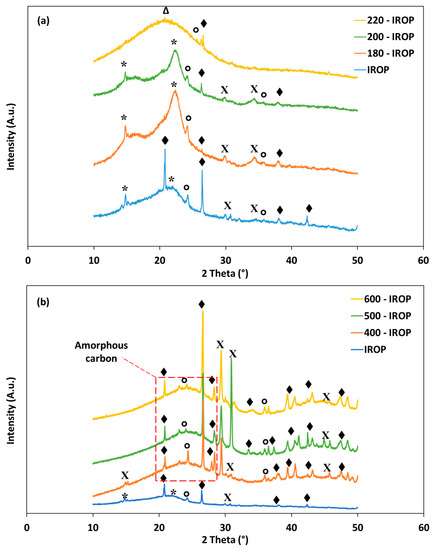 To apprehend the main structural differences between hydrochars and biochars produced from IROP, XRD analysis was conducted, and results were gathered in Figure 4. The main differences were spotted in the diffraction angles between 10° and 50° (2θ). The IROP presented a typical diffractogram to the majority of biomasses, characterized by amorphous cellulose I double peaks at 14.8° and 22.5° (2θ) [64]. After HTC, the resulting materials produced at 180 and 200 °C presented almost similar aspects. In fact, the peaks related to cellulose I kept the same position, but they increased in intensity and developed a more defined form. This behavior indicates the beginning of a possible degradation reaction of cellulose I into a more stable carbon form. When increasing the treatment temperature (220 °C), the cellulose peaks disappeared into a broad peak at 22.6° (2θ) which indicates its transformation into a disordered-like carbon [69]. On the other hand, raw and HTC produced materials presented a significant content in minerals, namely, SiO2, CaCO3 and Fe2O3. The presence of these impurities is associated with the natural composition of the biomass as well as the stocking conditions of the used impregnated feedstock [29].
