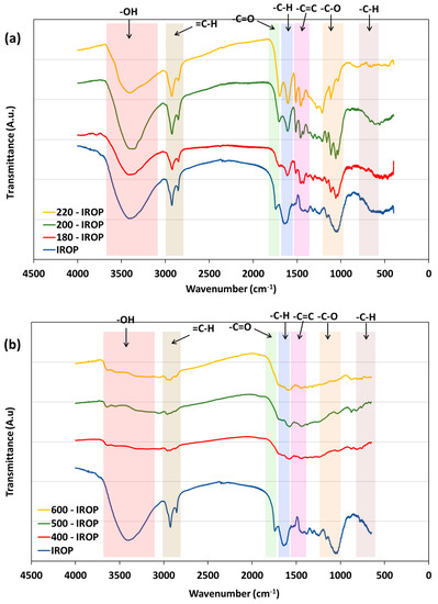 Infrared spectroscopy was performed on hydrochars and biochars produced from IROP and results were gathered in Figure 5. The recovered spectra show the presence of five main peak areas, namely –OH, C=O, C=C, –CH2/CH3, C–O and aromatic –CH, which exhibit a significant profile change with the applied conditions.