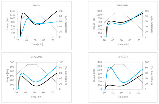 Pasting characteristics of plain (black lines) and fortified (blue lines) native and oxidised starches. Curves were recorded applying different concentrations of starch suspensions: native 5%; DS = 0.0014—5%; DS = 0.0036—8%; and DS = 0.018—20%.