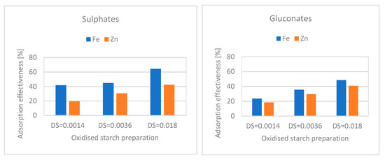 The data presented above indicate the good efficiency of copper ion adsorption by oxidised starches, and suggest the possibility of adapting this procedure to enriching food with other substances. Furthermore, essential microelements are available in the form of different salts, most often sulphates, gluconates, and fumarates, which may be important both in terms of bioavailability and the adverse effects of these substances [35]. Moreover, as indicated from the obtained results, the ionic mechanism of interaction between starch and starch and salts may result in different degrees of effectiveness in the adsorption of these substances. To evaluate the susceptibility of various cations to the adsorption, in addition to the effect of the associated anion on this process, a preliminary study using zinc and ferrous sulphates and gluconates was carried out. The results are presented in Figure 4. The salts’ concentration in the applied adsorption solutions corresponded to the content of 5 mg of individual cations per 1 g of starch, i.e., the highest value applied in the study of the adsorption efficiency of copper sulphate. The experiment proved that iron ions were more efficiently adsorbed than zinc ions. Moreover, higher adsorption efficiency was observed with sulphates than with gluconates. Nevertheless, all the salts used in this stage of the study were adsorbed with less efficiency than copper sulphate. For this reason, adsorption of microelements in the form of sulphates should be recommended, particularly because they are present in the supplement market in this form [36].