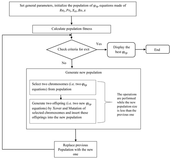 Recently, using intelligent methods for modeling, the thermal and hydrodynamic characterizations of different systems have received much attention [63,64,65,66,67]. In the present paper, GP was used for obtaining a general nonlinear correlation for predicting the HTC during the condensation of fluids inside multi-port mini/micro-channels. The flowchart of the present GP model is shown in Figure 1.