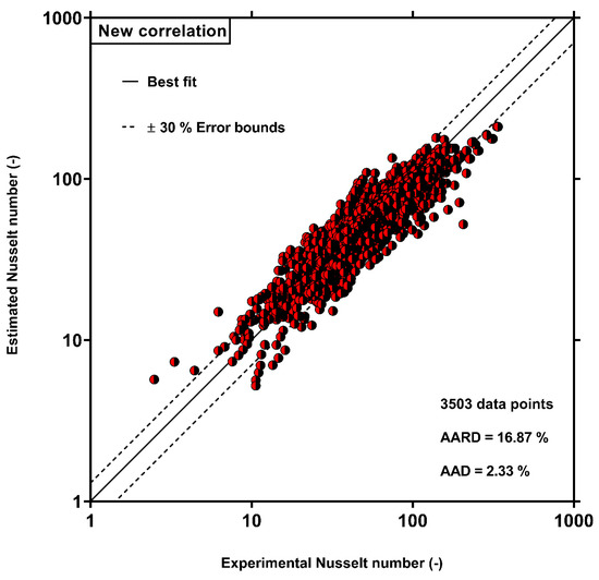 Comparison between the Nusselt number estimated by Equation (13) and the measured data. The solid points represent the outcomes of Equation (13). The solid line represents the best fitting between experimental and estimated data, and the dash lines represent the error bounds.