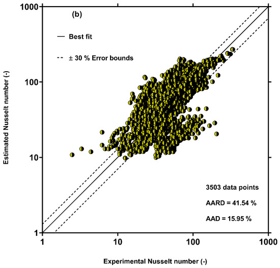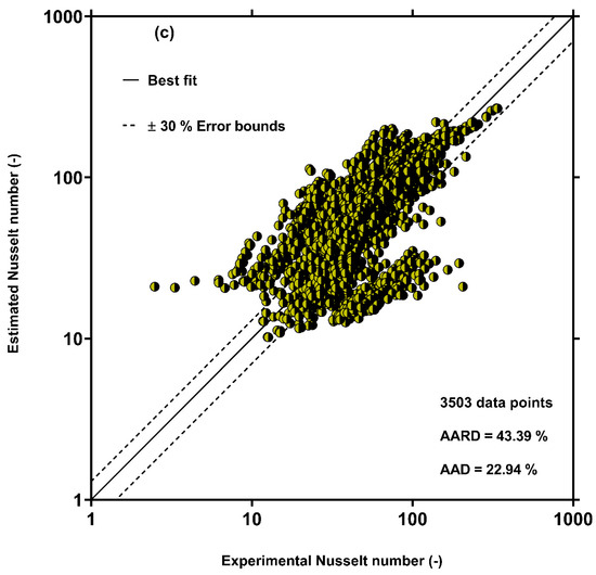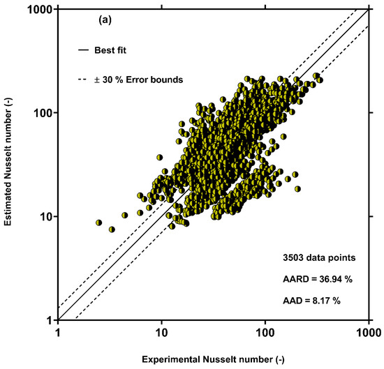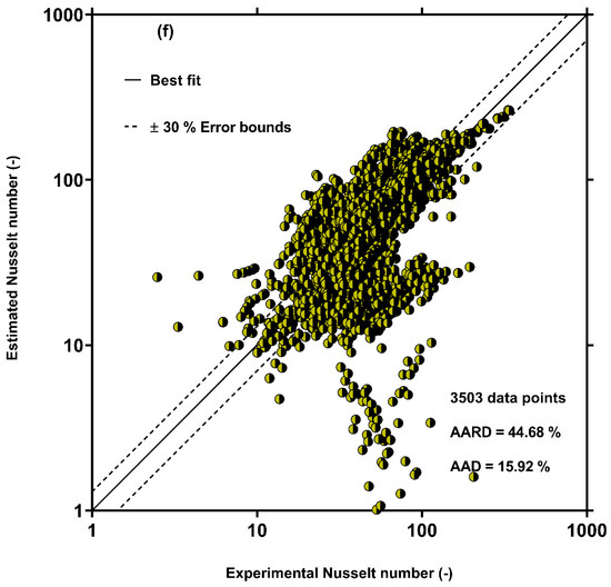 To show the performance of the established model for estimating the HTC, the predicted Nusselt number values were compared with the measured values in Figure 2. This result verifies that the GP correlation predictions given by Equation (13) were in the desired range, and most of the data were bounded with an error of less than 30%. The calculations showed the suggested correlation estimates of the 3503 data points with an AARD value of 16.87%. In addition, predicted data with an error of less than 20% and 30% for the GP correlation were 70.37% and 84.73%, respectively. These results showed excellent accuracy of the correlation obtained by the GP for approximating the condensation HTC inside multi-port channels.