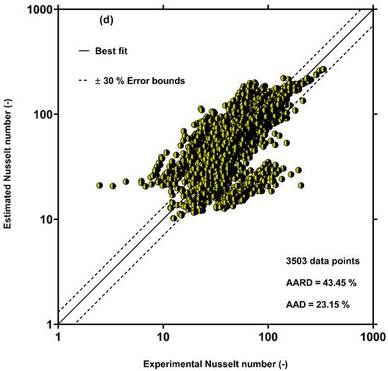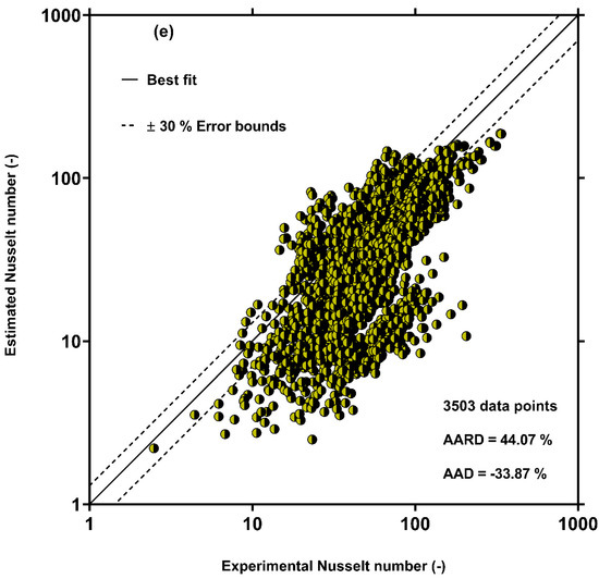 The accuracy evaluation of previous models and our model for estimating the HTC inside multi-port micro and mini-channels based on Kandlikar [19] classification was given in Table 5. This table verifies that GP correlation (Equation (13)) can predict the HTC in both micro and mini-channels reasonably well and exhibits the best agreements with the experimental data among all available models with AARD of 16.60% and 16.91% for micro- mini channels, respectively. In addition, our approach predicts almost 85% of data for both micro- mini channels with an error of less than 30%. The Kim and Mudawar correlation [52] predicts 63.44% of the data for mini-channels with an error of lower than 30%. However, its overall accuracy for mini-channels is not satisfactory, with an AARD of 36.94%. In addition, its deviations for micro-channels are much more significant, and its AARD for micro-channels is 59.10%.