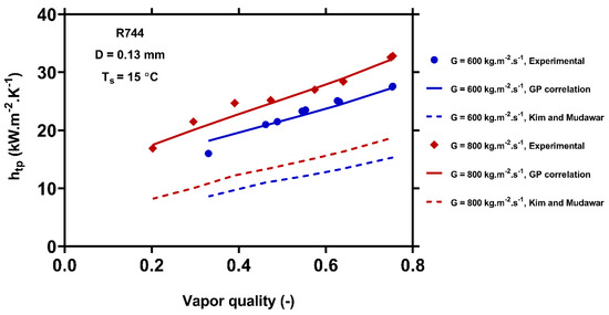 Comparison of the predictions of the GP correlation (Equation (13)) and the model of Kim and Mudawar [52] with the experimental data [37] for R744 condensing at the saturation temperature of 15 inside a 0.13 mm channel under different vapor qualities and mass fluxes. Blue and red points represent the G = 600 and G = 800 , respectively. The solid points, solid lines, and dash lines represent the experimental values, GP outcomes, and Kim and Mudawar [52] outcomes.