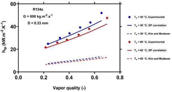 The predicted HTCs for R134a are examined in contrast to the real data for saturation temperatures of 50 and 60 °C in Figure 5. This result showed that the HTCs for the saturation temperature of 50 °C were higher than those for 60 °C. Table 6 presents the thermophysical characteristics of the R134a at the saturation temperatures of 50 and 60 . Reducing the saturation temperature led to higher liquid density and lower vapor density. Therefore, the vapor velocity was increased, and the liquid velocity was reduced and led to a higher velocity difference at the two phases interface. Therefore, higher interfacial shear stress and thinner liquid film were obtained at the lower saturation temperature, and the HTC increased. In addition, R134a had a higher liquid thermal conductivity at the saturation temperature of 50 °C. Therefore, its thermal resistance in liquid film at this temperature was lower, which resulted in a higher HTC. Figure 5 shows that the GP and Kim and Mudawar [52] correlations showed the same trends for different saturation temperatures. However, the GP correlation led to a much better agreement with the experimental data.