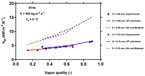 Comparisons of the predictions of the GP correlation (Equation (13)) and the model of Kim and Mudawar [52] with the experimental data [82] for R744 condensing at the mass flux of 800 and saturation temperature of 0 °C inside different channel diameters. Blue and red points represent the D = 68 mm and D = 78 mm, respectively. The solid points, solid lines, and dash lines represent the experimental values, GP outcomes and Kim and Mudawar [52] outcomes.