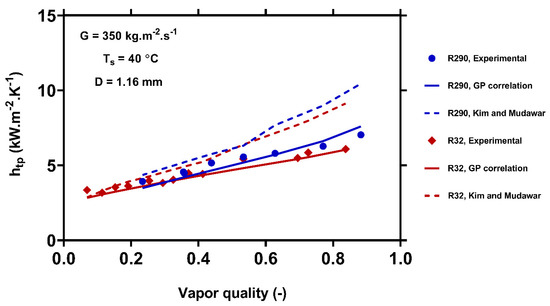 Comparison of the predictions of the GP correlation (Equation (13)) and the model of Kim and Mudawar [52] with the experimental data [73,76] for R290 and R32 condensing at the mass flux of 350 and saturation temperature of 40 inside a 1.16 mm channel. Blue and red points represent the R290 and R32, respectively. The solid points, solid lines, and dash lines represent the experimental values, GP outcomes, and Kim and Mudawar [52] outcomes, respectively.