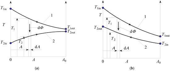 The previous overall solutions are also reached by the so-called global approach to the problem. Such an approach will provide a solution also for all forms of cross-flow recuperators. From the temperature flow of stream along the heat exchanger surface of the cross-flow recuperator, it is intuitively inferred that the finite values of π2stac exist, for which maximum exergy destruction also occurs. In order to achieve this in general, the global exergy balance is set for the total heat exchanger area, shown in Figure 4.