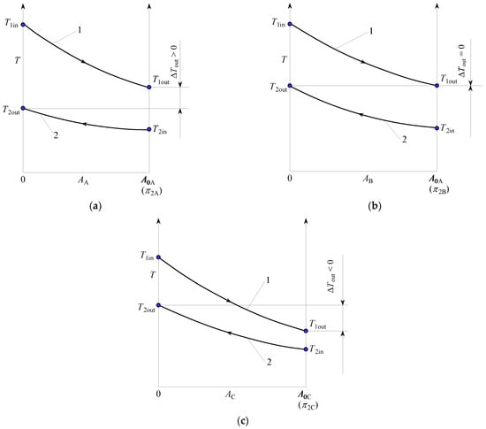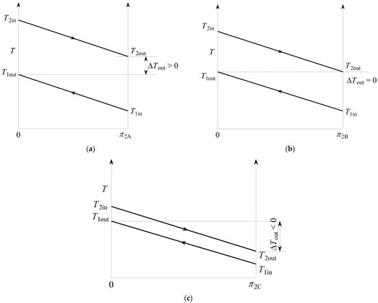 Characteristic π2 values and temperature streams in the counter-flow recuperators A, B and C: (a) ΔTout > 0. (b) ΔTout = 0. (c) ΔTout < 0.