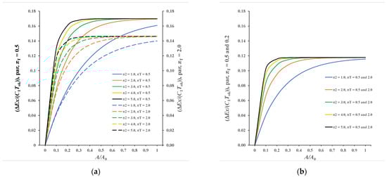 The diagram in Figure 7a shows that the value of local exergy destruction continuously increases from zero to the values achieved for A/A0 = 1.0, with the corresponding π2. The respective values are shown for the selected π2 for the abscissa A/A0 = 1.0 and are as follows: 0.2522, 0.2894, 0.3056, 0.3067 and 0.3068. All curves tend to their asymptotic value determined by Equation (53), and this value for πT = 0.50 equals 0.30685. This means that these types of recuperators have practically already reached the maximum exergy destruction for π2 ≥ 3.0, and for these values the outlet temperature of the weaker stream, according to Equation (27), will practically achieve the value T1out = T2in = Tsat that represents the saturation temperature of a stronger stream.
