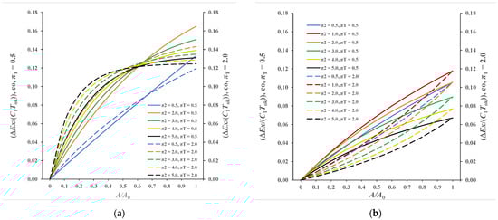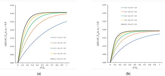 The situation is completely similar in Figure 7b, which refers to πT = 2.0. Total values of exergy destruction at A/A0 = 1.0 are 0.1738, 0.1907, 0.1928, 0.1931 and 0.1931, while the maximum value of exergy destruction for this case is 0.19315. Maximum asymptotic values are explicitly confirmed by Equation (55).