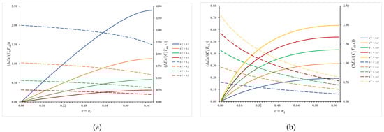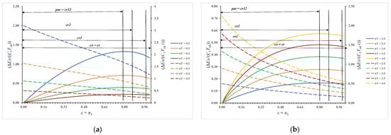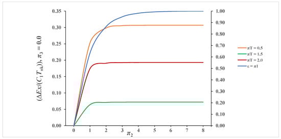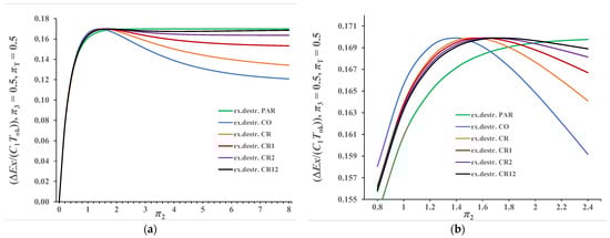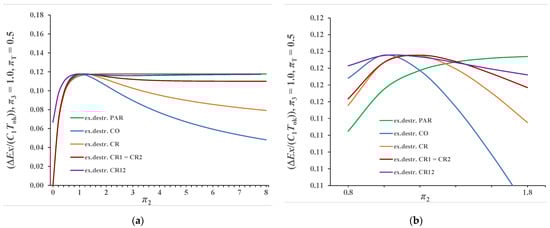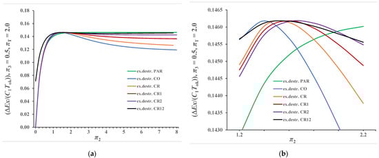 Figure 10a,b represents results when π3 = 0.50 and πT = 2.0. The behavior of the curves is like that in the previous case, with the difference that in this case lower values of exergy destruction were obtained. The values π2stac in this observed case remained unchanged compared to the previous case because π3 also equals 0.50. Only the maximum value of exergy destruction decreased, which in this case, according to Equation (40), equals (∆Ex/(C1Tok))max = 0.1462.
