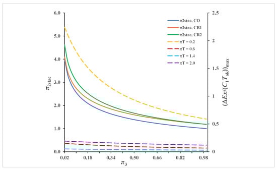 The diagram in Figure 12 shows that the values π2stac continuously decrease with increasing π3, from the value π2stac → ∞ if ε → 0, to the π2stac (εmax = 1.0) = 1.0 for the counter-flow recuperator (co), and up to the common value π2stac (εmax = 0.632) = 1.1814 for π3 = 1.0 for both cross-flow recuperators (cr1) and (cr2). This is in accordance with Equations (47) and (48) which become identical for π3 = 1.0. Furthermore, it can be concluded that for the same values of π3, values of π2stac are the lowest in the counter-flow recuperator (co), slightly higher in the cross-flow recuperator (cr1) and highest in the cross-flow recuperator (cr2).