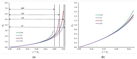 The diagrams in Figure 15 show a clearer meaning of the stated restrictions of individual recuperator types. Figure 15a,b represents the dependence of π2 on effectiveness for selected recuperators when π3 = 0.25. It is evident from these diagrams that for 0 ≤ ε ≤ εstac = 0.80 and for the same ε and π3 value, π2par > π2k2 > π2k1 > π2co. This means that for the same values of heat transfer coefficient and heat capacity of the weaker stream there will be the following connection between heat exchanger area of the observed recuperators: A0par> A0cr2 > A0cr1 > A0co.