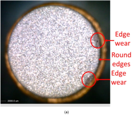 In Figure 21, the images, captured by DINO camera at a magnification of 30.6×, show the effect of Ton on the surface and profile of the tool tip. The rounding of edges can be observed in Figure 21a,b, though at lower Ton, there is more damage to the surface of tool and its corners. The rounding of corners resulted in change in the roundness of tool tip, hence in the profile of tool.
